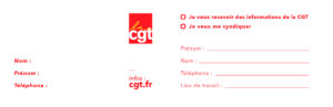 Des cartes de visite détachables sont en cours de livraison dans les UD. Toutes les explications sur ce premier support de prise de contact et syndicalisation sont ici : https://www.cgt.fr/carte-syndicalisation